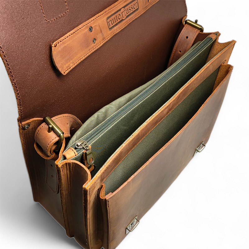 La serviette Ruitertassen est constituée de deux compartiments et une large poche avant. La poche avant est très utile pour les petits accessoires genre stylos, cables, ou cahier. Les deux compartiments sont de capacité différente le premier est moins large que le second . Le second soufflet est très large (10 cm) . Il possède une cloison moussée pour protéger un ordinateur (34*24cm)