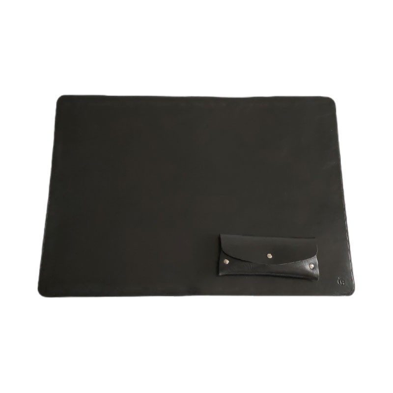 Cet article de bureau est réalisé à la main, en Hollande. Il a un look brut, sans couture, sans dorure. Un marquage CB signe discrètement la marque en bas à droite de la plaque de cuir. Le dessous est lui également brut laissant apparaitre le retour de la peau.