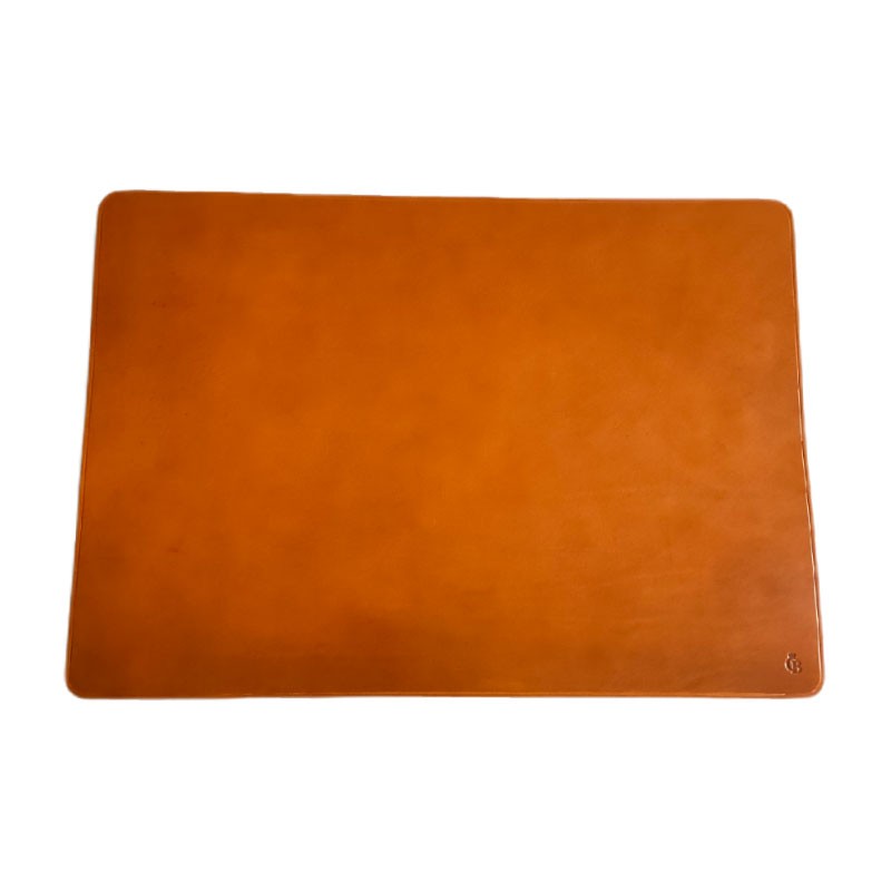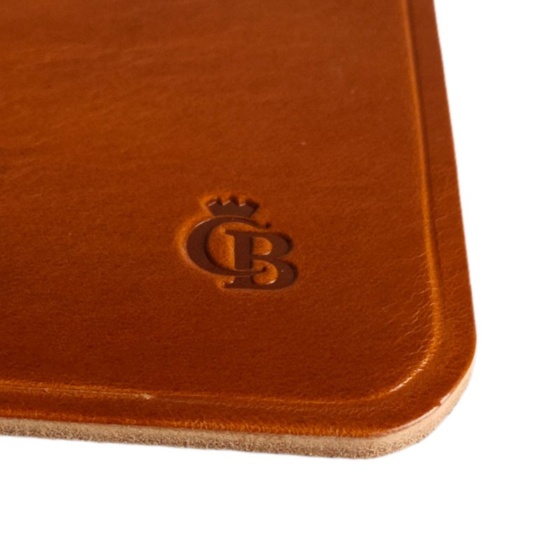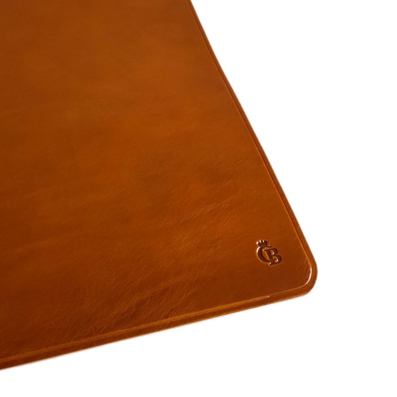 Cet article de bureau est réalisé à la main, en Hollande. Il a un look brut, sans couture, sans dorure. Un marquage CB signe discrètement la marque en bas à droite de la plaque de cuir. Le dessous est lui également brut laissant apparaitre le retour de la peau.