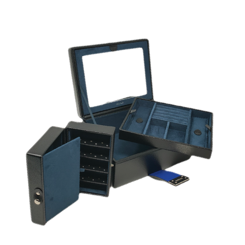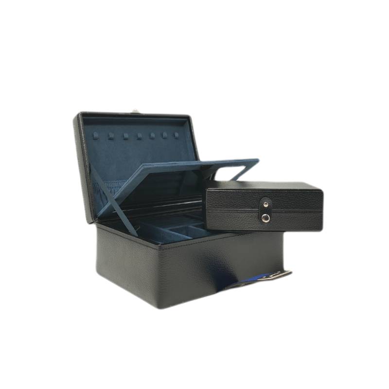 Dés son ouverture, vous découvrez un plateau avec des emplacements pour vos bagues, vos montres et broches. Ce plateau est amovible pour pouvoir accéder au fond du coffret. Ce fond sera utile pour y placer tout types de bijoux!