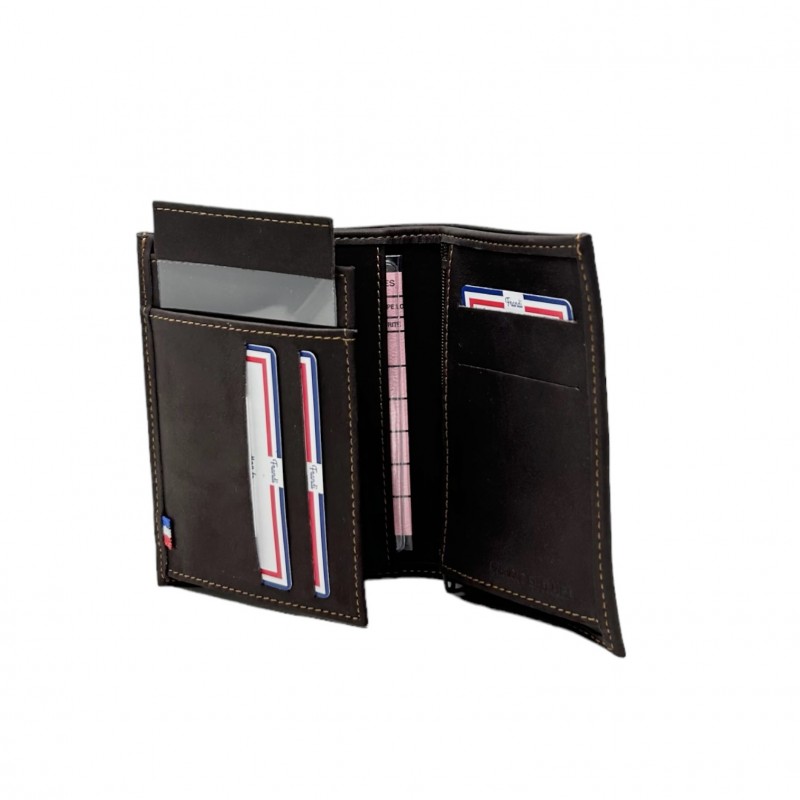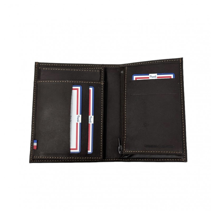 Le portefeuille FRANDI est un accessoire pratique et élégant. Fabriqué en cuir de haute qualité, il présente une finition lisse avec la particularité d'être dans un cuir très doux effet peau de pêche, ce qui est communément appelé un cuir nubuck.
