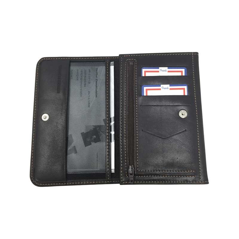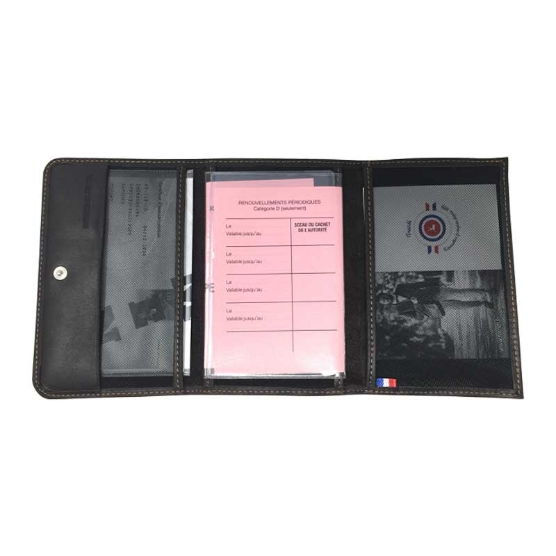 Nombre d'emplacements : Trois emplacements carte grise et permis de conduire, six emplacements cartes de crédits, poche monnaie zippée