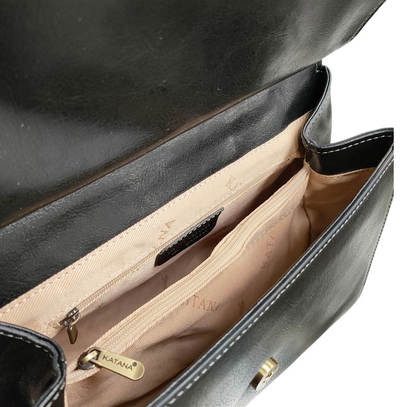 Quand vous l'ouvrez, vous trouverez un large compartiment avec une poche zippée centrale. Au dos du sac à main KATANA se trouve une poche plate zippée pour les clés ou une carte à attraper rapidement.