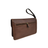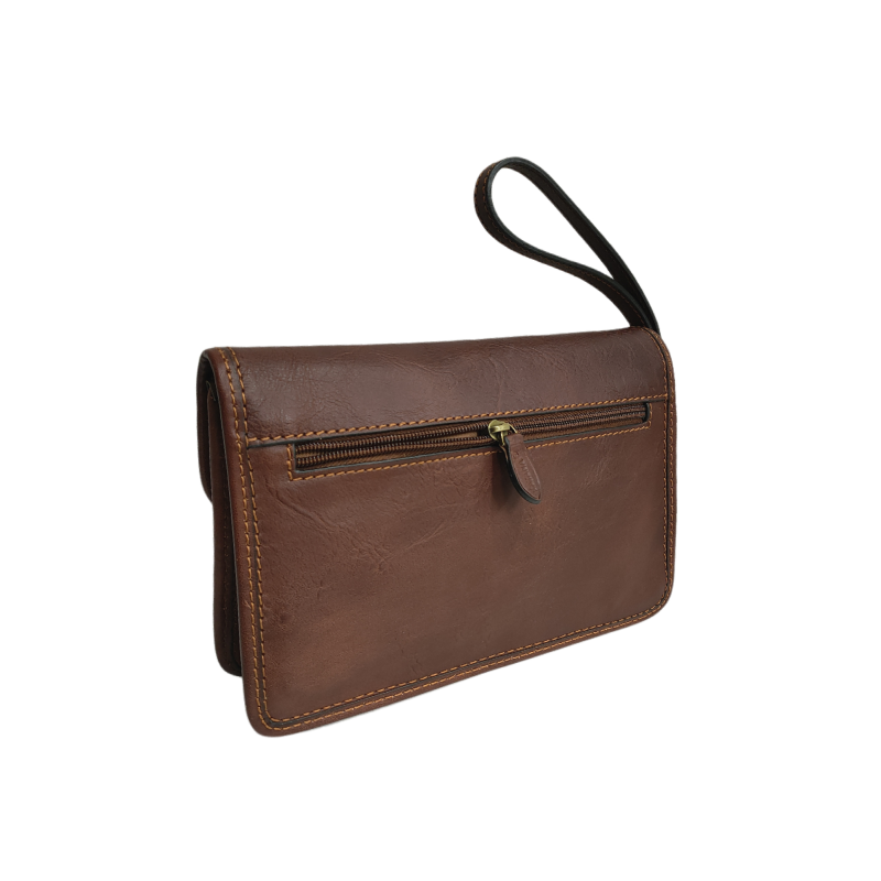 Une sacoche se tient à la main à l'aide d'une dragonne en cuir. Elle est fermée d'une serrure esthétique et performante.