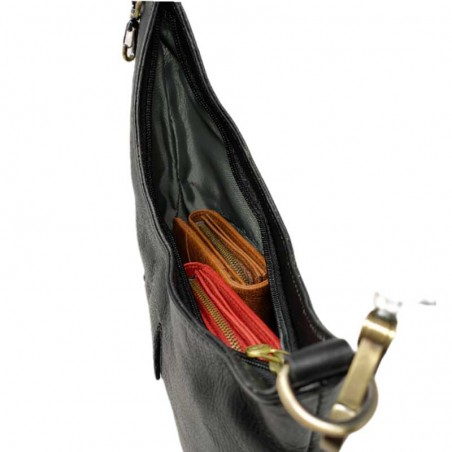 A l'avant, vous découvrez une petite poche à rabat, pratique pour glisser un titre de transport ou un ticket de parking que vous voulez attraper rapidement. L'intérieur est composé d'une poche plate zippée et de 2 petites poches pour votre téléphone et vos clés. Vous pourrez y loger votre portefeuille ou compagnon, un petit parapluie, un porte monnaie et bien d'autres choses. A l'arrière, il possède également une poche plate zippée.