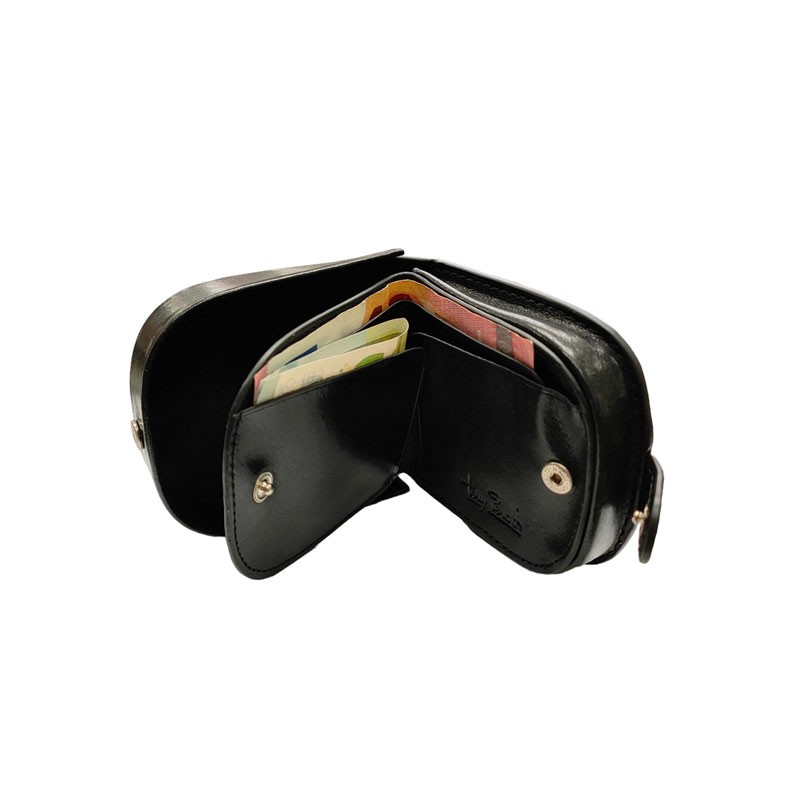 Le porte monnaie de forme cuvette ou porte monnaie en fer à cheval est un modèle hyper pratique. On fait coulisser la monnaie dans la partie creuse pour attraper les petites pièces... un emplacement de rangement des billets est à l'intérieur de la cuvette.  Une pression permet de sécuriser l'ensemble du porte monnaie.