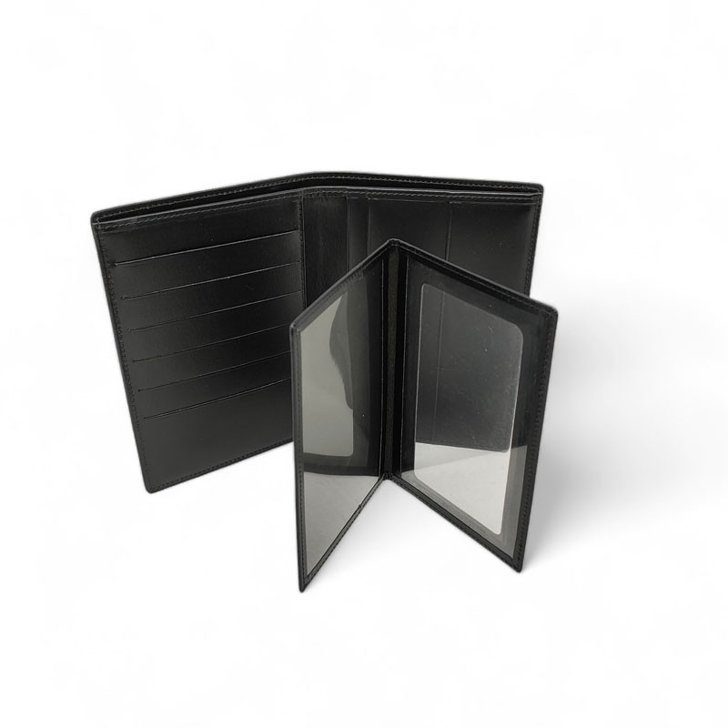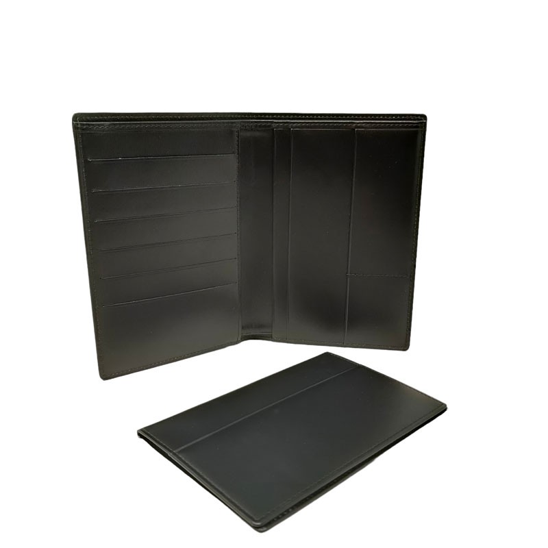 L' intérieur du portefeuille est en cuir qualité box . Il est composé d'un côté de six emplacements pour les cartes de crédit, et une poche plate . De l'autre côté, il y a deux emplacements plats. Une partie détachable vient se ranger d'un côte ou de l'autre. Avec et sans cette partie amovible, le portefeuille est plat
