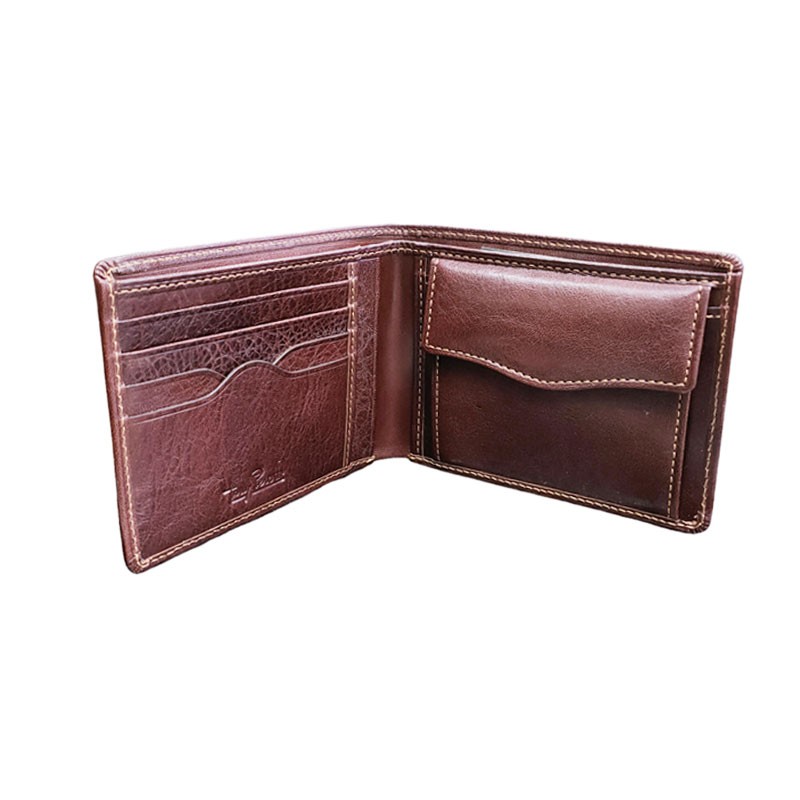 A l'intérieur on découvre une poche à pression pour la monnaie, 2 poches pour les billets, 4 emplacements pour les cartes de crédit et 3 emplacements plats pour les papiers d'identité.