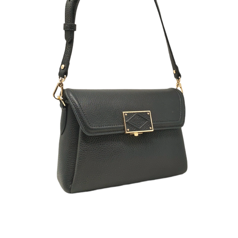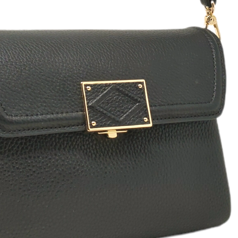 Pourchet signe son sac d'un joli fermoir posé sur le rabat telle une bijouterie précieuse . On y retrouve un cuir embossé du losange Pourchet. Le rabat surpiqué ainsi que le pli du cuir mettent en valeur le design épuré du sac.