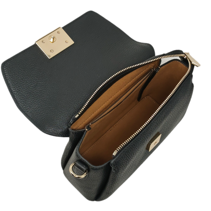 Une fois le fermoir poussoir ouvert, vous découvrez sous le rabat une fermeture zippée reprenant tout le sac et sécurisant ainsi son contenu. Le sac est composé de 3 compartiments. Le compartiment central est le plus contenant . Vous y glissez portefeuille, clés lunettes. De chaque côté de celui ci se trouvent une poche plate, pour le téléphone, carte de transport... tout ce que l'on veut attraper sans chercher. Vous apprécierez la doublure en alcantara.