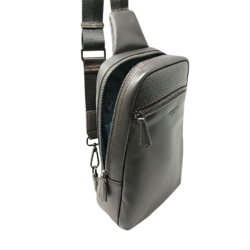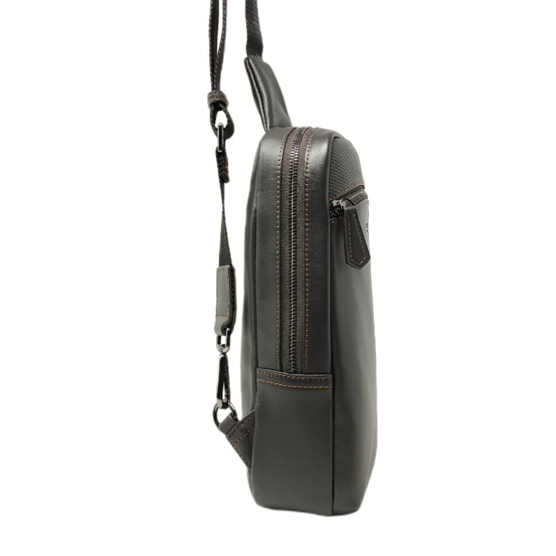 Sur le devant du sac Pourchet vous avez une poche plate zippée d'une grande capacité, suivie d'un compartiment principal possédant une large ouverture afin de voir rapidement vos affaires personnelles. Son originalité est cette bande de cuir imprimée épis sur le devant du holster.