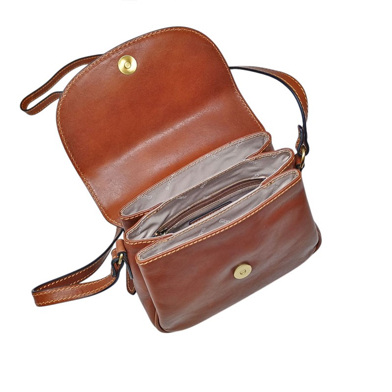 L'intérieur est composé de 3 poches. La poche centrale est la plus contenante. Deux poches plus fines sont disposées de chaque côté. Au dos du sac se trouve une poche plate zippée. La bandoulière est en cuir coordonné