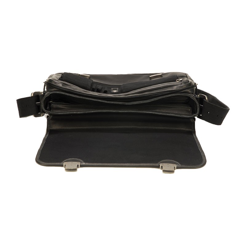 Vous trouverez sous le rabat, un premier compartiment qui ferme à l'aide d'un zip et qui possède un renfort pour un PC portable de taille max: 38x25 cm, mais également 2 emplacements pour les stylos, une petite poche plate ainsi qu'une poche plate zippée. Ce compartiment sera idéal pour votre PC et vos dossiers ou documents au format A4. Le second compartiment ferme aussi à l'aide d'un zip et il est simple à l'intérieur, il pourra accueillir vos dossiers ou documents mais aussi votre chargeur de PC. A l'avant, vous découvrez plusieurs petites poches pour vos accessoires et vos affaires personnelles comme un accroche clés, 3 emplacements pour vos stylos, des petites poches à rabat qui ferment à l'aide d'un velcro ainsi qu'une belle poche plate zippée. Vous trouverez également une poche plate zippée sur le rabat, pratique pour attraper ce dont vous avez besoin rapidement comme votre téléphone, un titre de transport ou encore un ticket de parking.