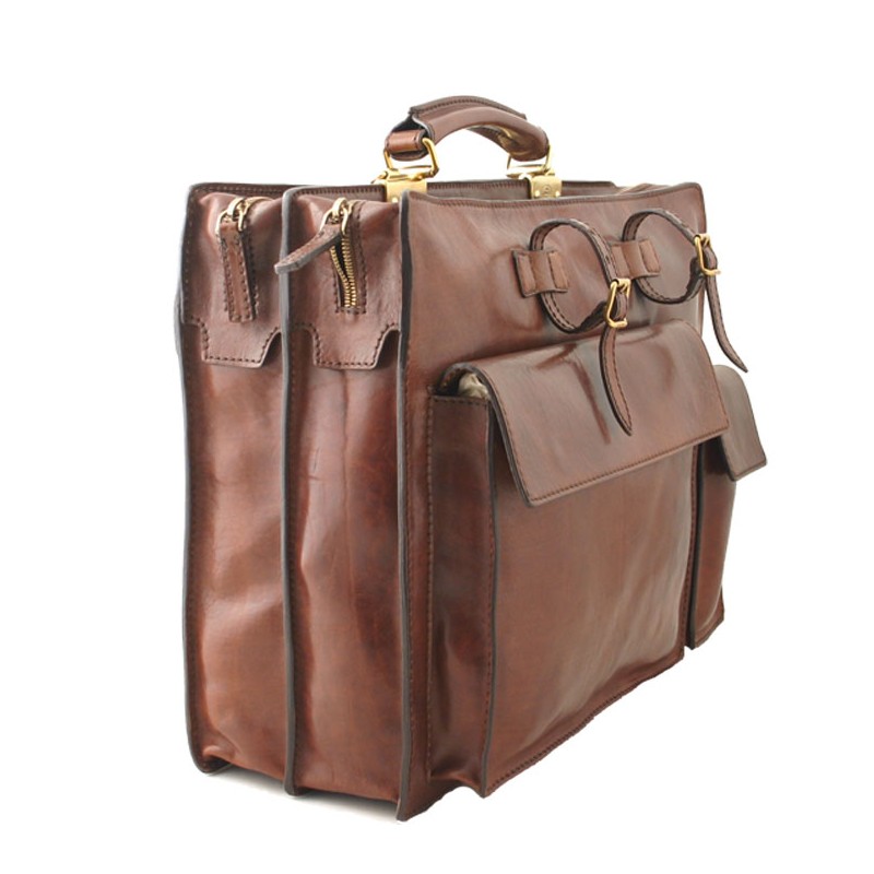 Le premier compartiment  possède des poches plates . Le second possède 2 poches plates identiques ainsi qu'une poche pour le téléphone portable. Sur l'avant on trouve deux grandes poches fermées par des aimants ainsi que des sangles en cuir ( amovible) pour fixer un parapluie(sec) ou un journal. Une poche plate zippée au dos.