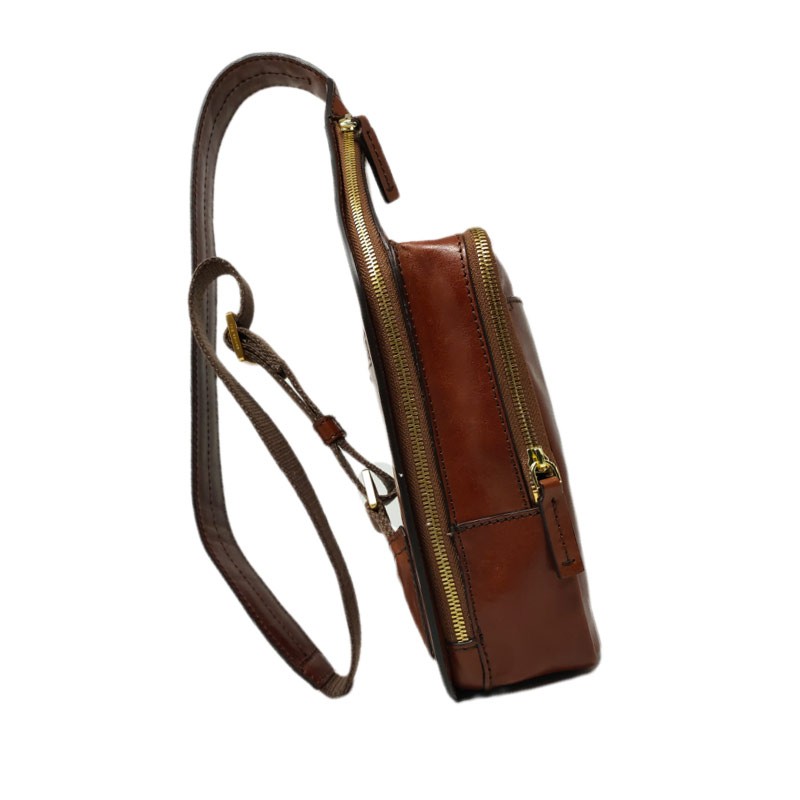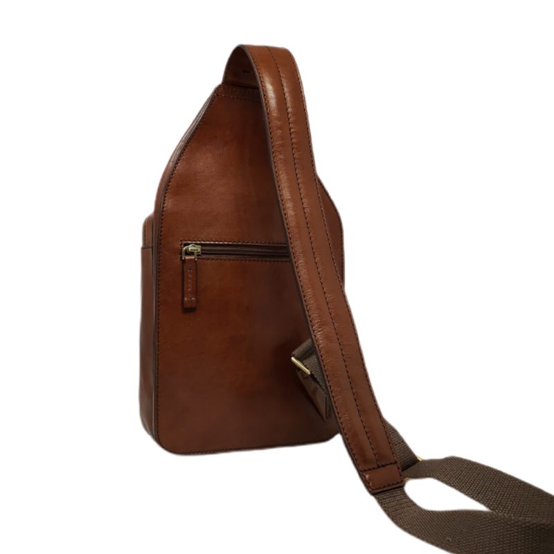 La bandoulière est composée en cuir et en toile coton. Elle est fixée d'une manière asymétrique aussi le sac est conçu pour les droitiers