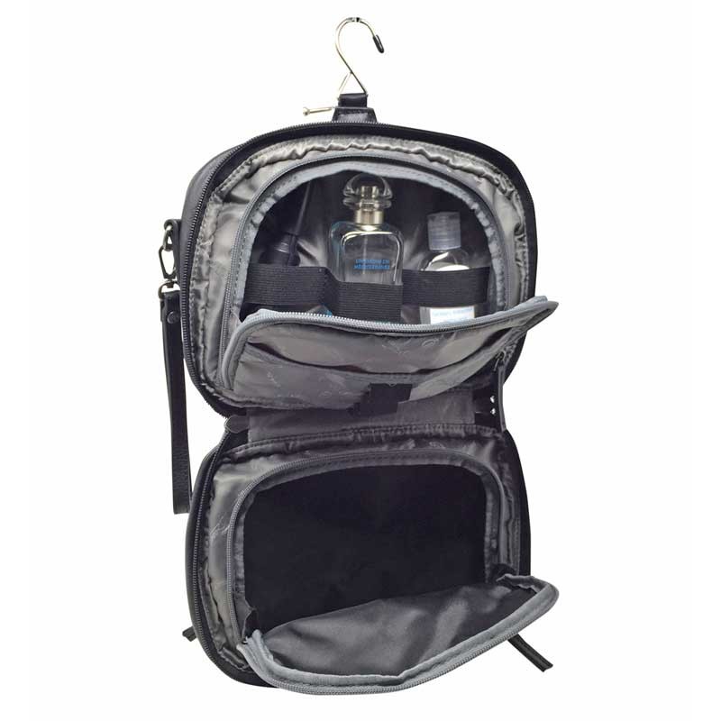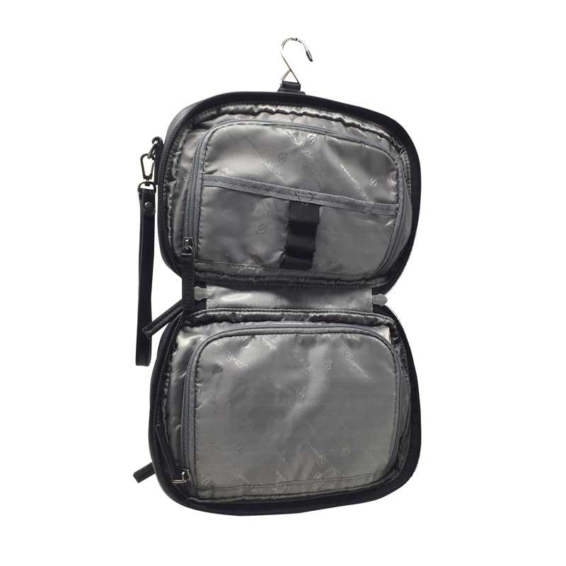 Cette trousse de toilette s'ouvre en deux parties, Chaque partie sont totalement fermée d'un zip. Aussi vos objets restent à leur place et assure un rangement efficace. La trousse peut être posée à plat ou suspendue à un crochet. Vous trouverez de nombreux rangements élastiqués ou non. Dans le compartiment du haut vous pourrez disposer vos flacons comme le gel douche et le shampoing, mettre votre brosse à dent, peigne ou rasoir à l'extérieur dans les élastiques ainsi que de petits accessoires comme une boite à lentilles de contact. Dans le compartiment du bas, vous pourrez mettre vos produits comme un déodorant, une mousse à raser ou même un rasoir électrique. A l'avant, vous trouverez aussi une petite poche plate zippée.